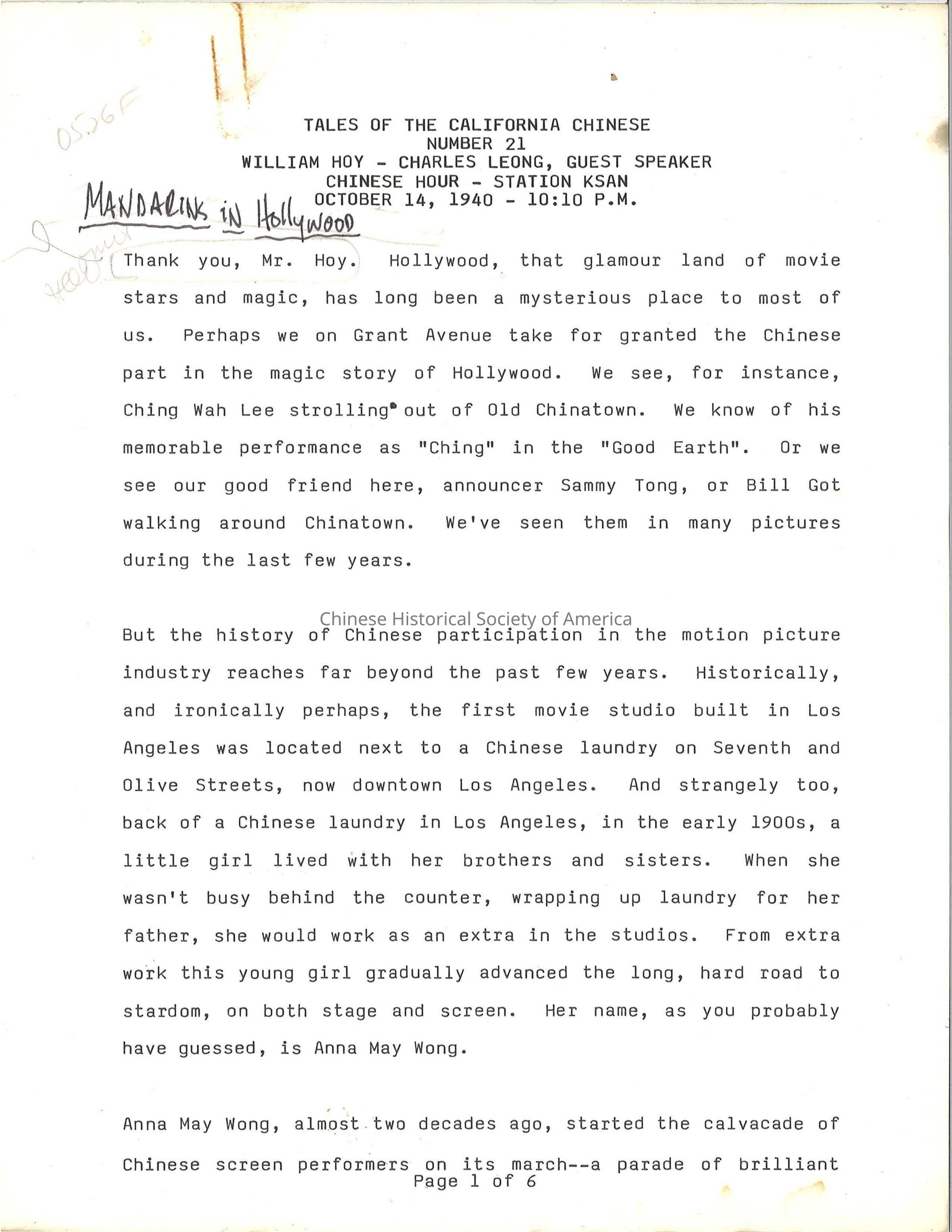 A manuscript copy of William Hoy's "Tales of the California Chinese" Number 21 from Chinese Hour on Station KSAN of October 14, 1940.