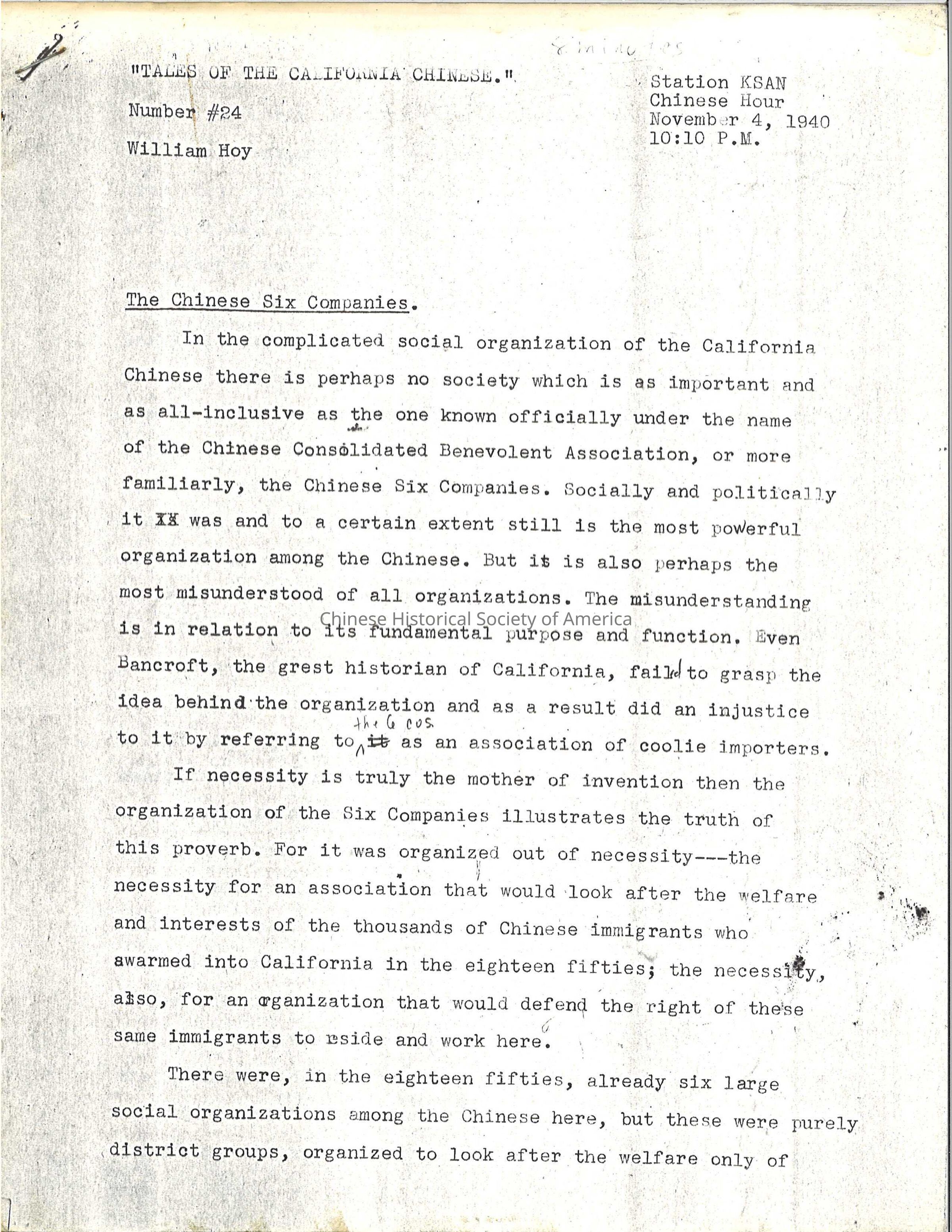 A manuscript copy of William Hoy's "Tales of the California Chinese" Number 24 from Chinese Hour on Station KSAN of November 4, 1940.