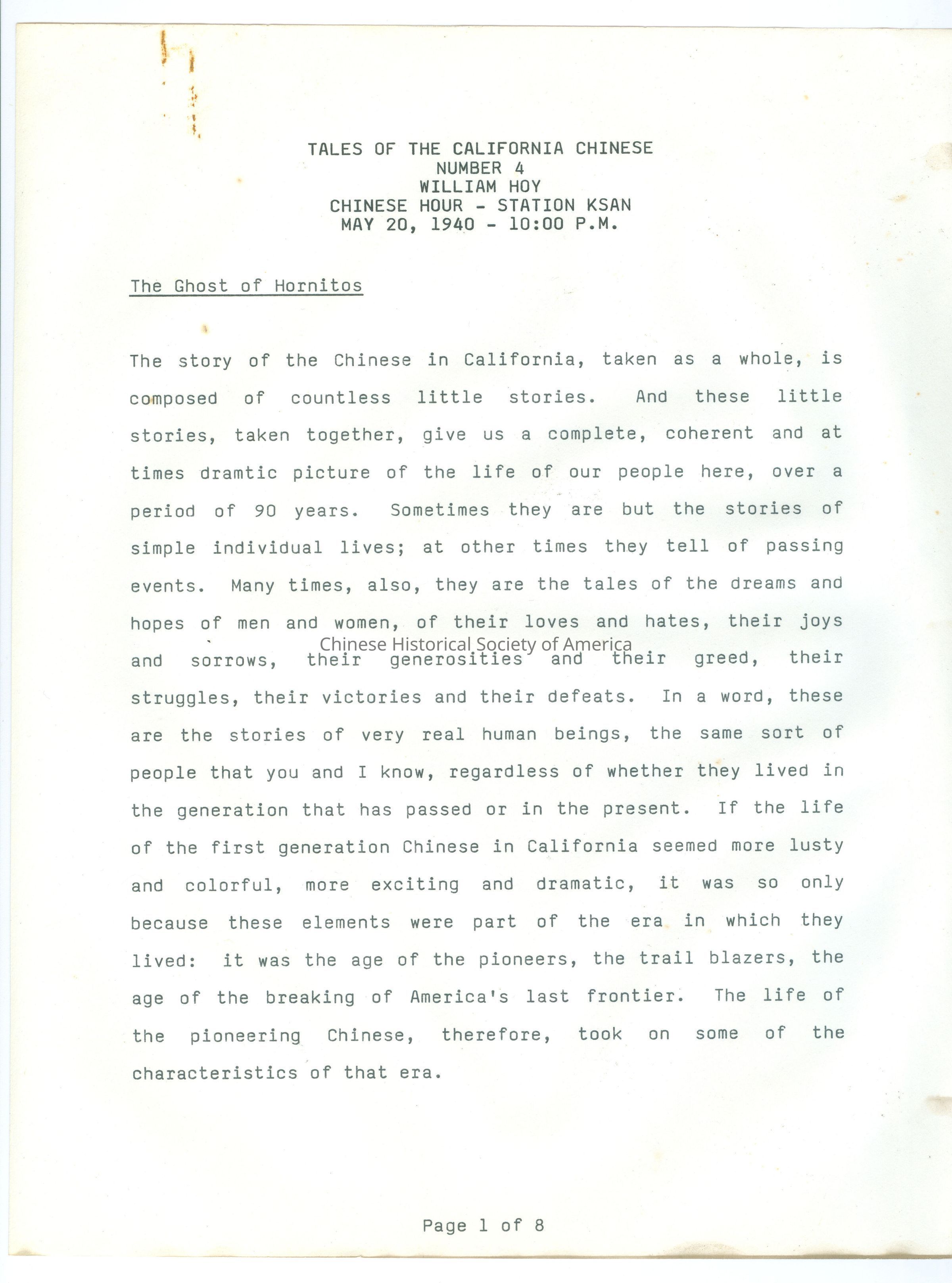 A manuscript copy of William Hoy's "Tales of the California Chinese" Number 4 from "Chinese Hour" on Station KSAN of May 20,1940.