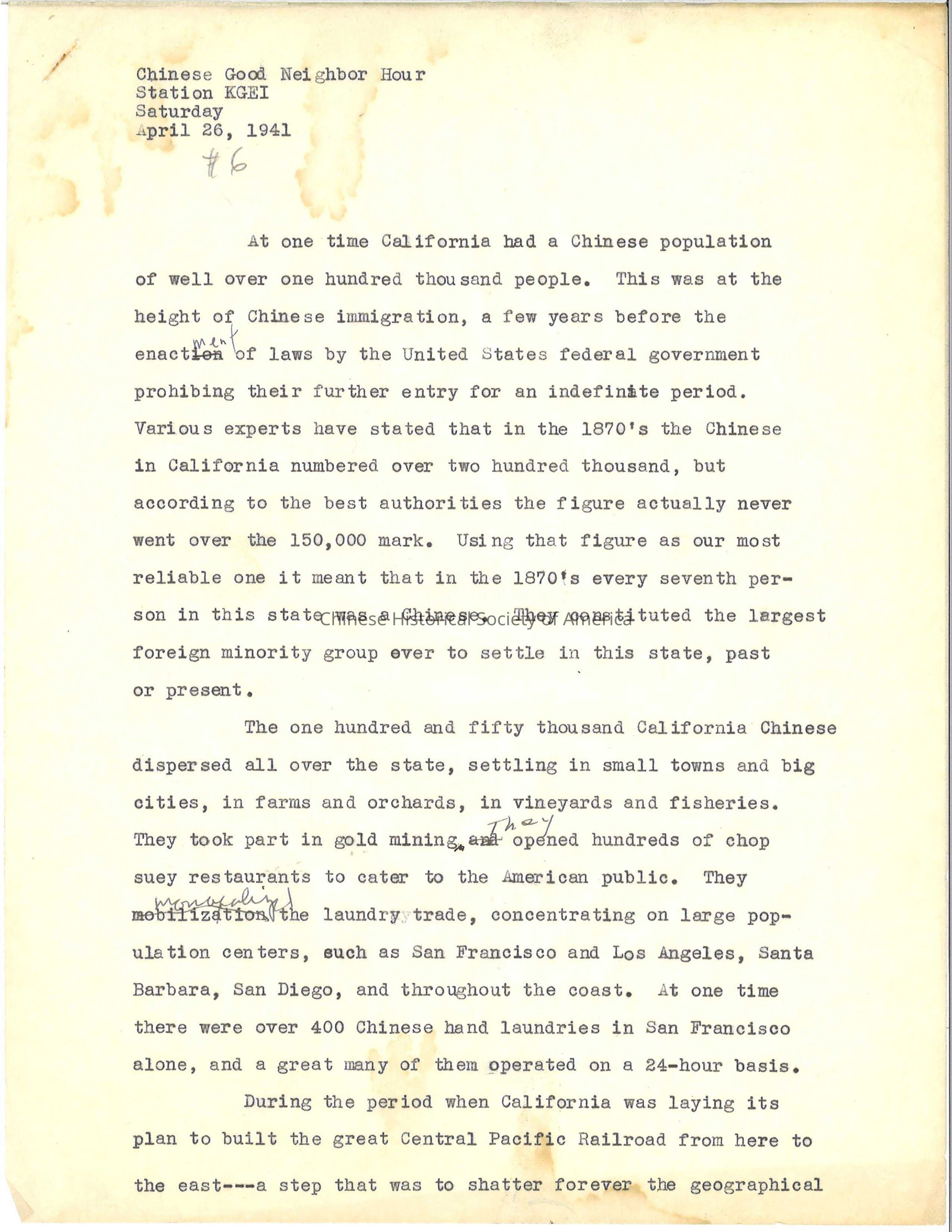 A manuscript copy of William Hoy's "Tales of the California Chinese" Number 6 from Chinese Good Hour Neighbor Hour on Station KGEI of April 26, 1941.