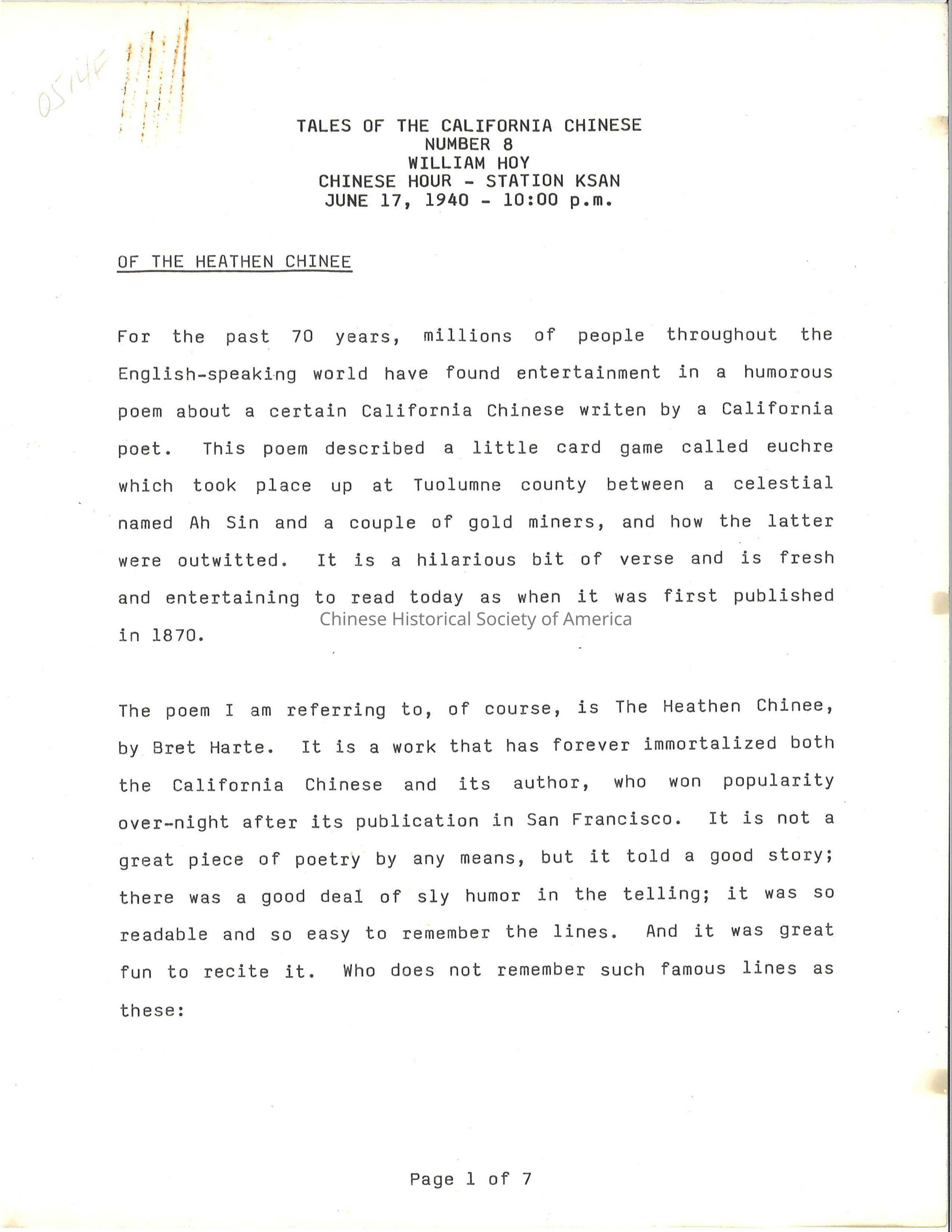 A manuscript copy William Hoy's "Tales of the California Chinese" Number 8 from Chinese Hour on Station KSAN of June 17,1940.