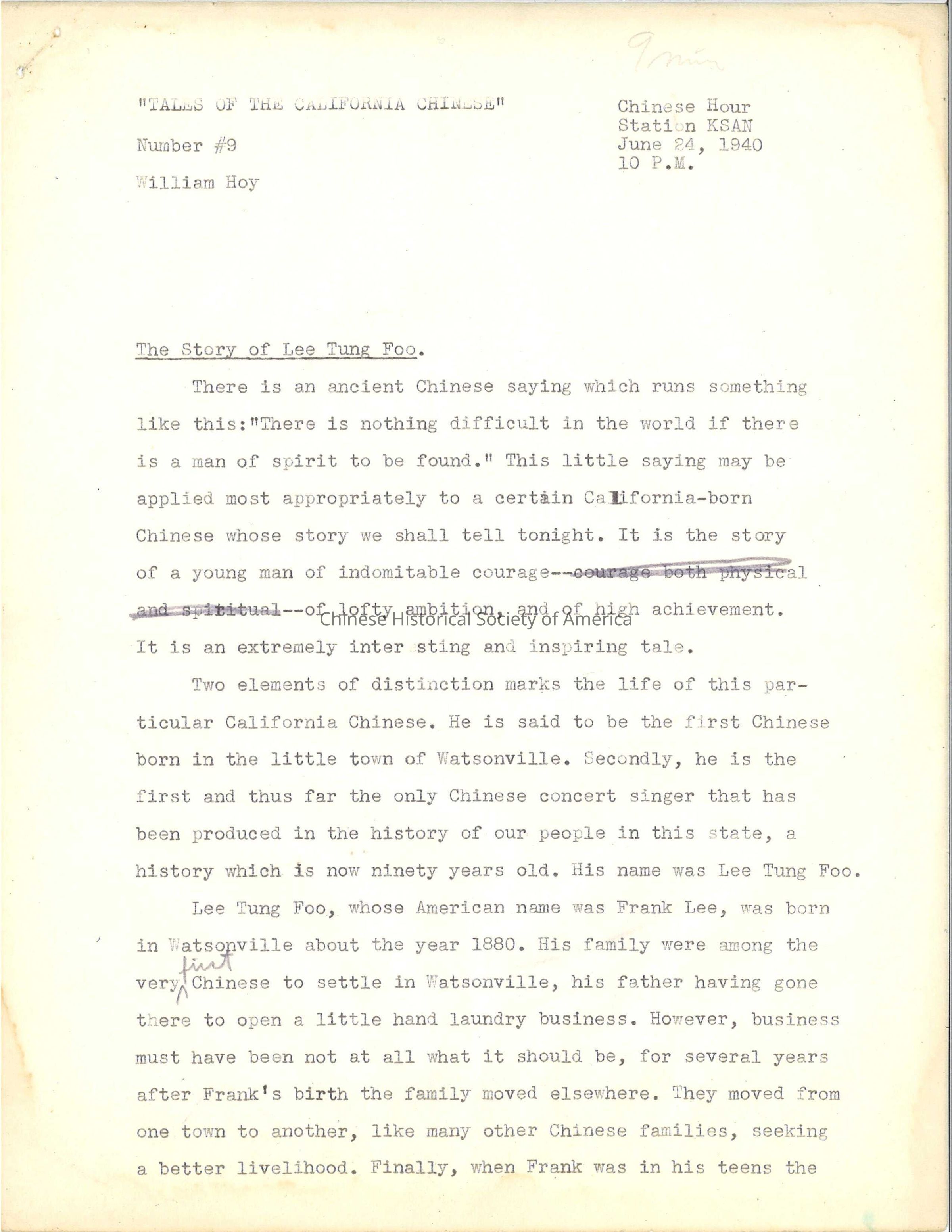 A manuscript copy of William Hoy's "Tales of the California Chinese" Number 9 from Chinese Hour on Station KSAN of June 24, 1940.