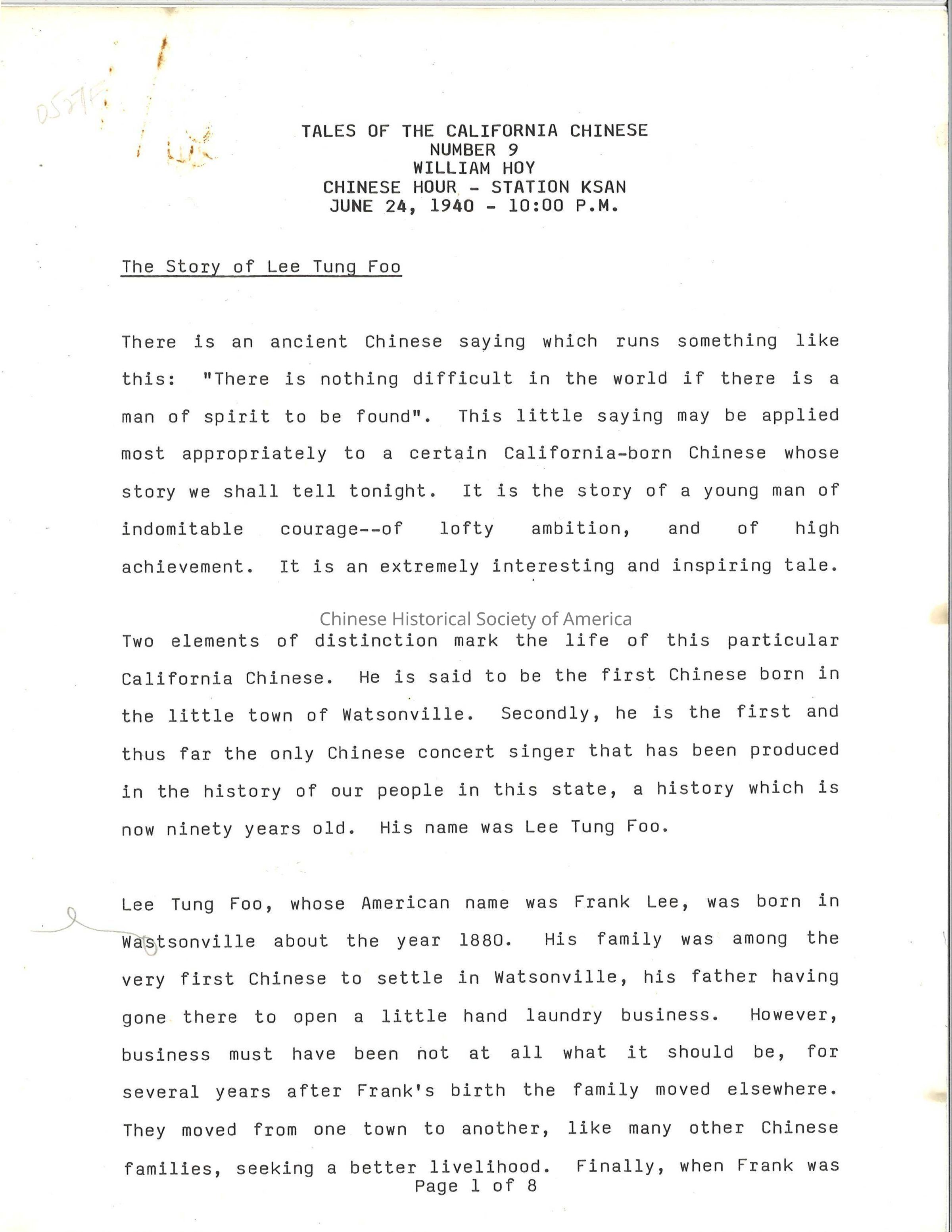 A manuscript copy of William Hoy's "Tales of the California Chinese" Number 9 from Chinese Hour on Station KSAN of June 24, 1940.