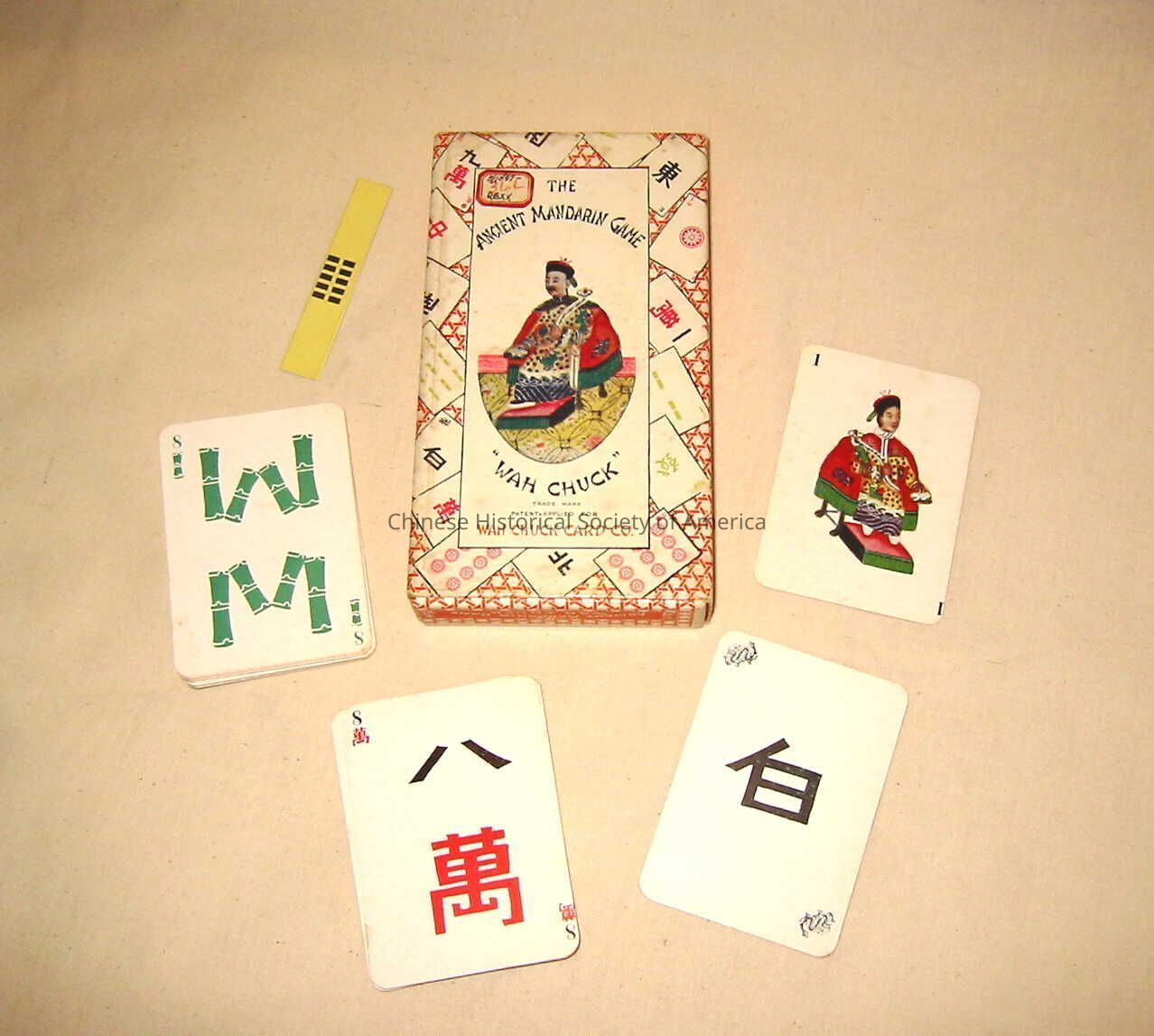 Items A-B. "The Ancient Mandarin" card game in original box. TOP LID IMPRINT: "The Ancient Mandarin Game, 'Wah Chuck,' trademark Patent Applied for Wah Chuck Card Co;" various cards with Chinese characters; one man dressed in traditional Chinese outfit. Game is similiar to "Mah-Jong," but played as a card game instead.Dimensions