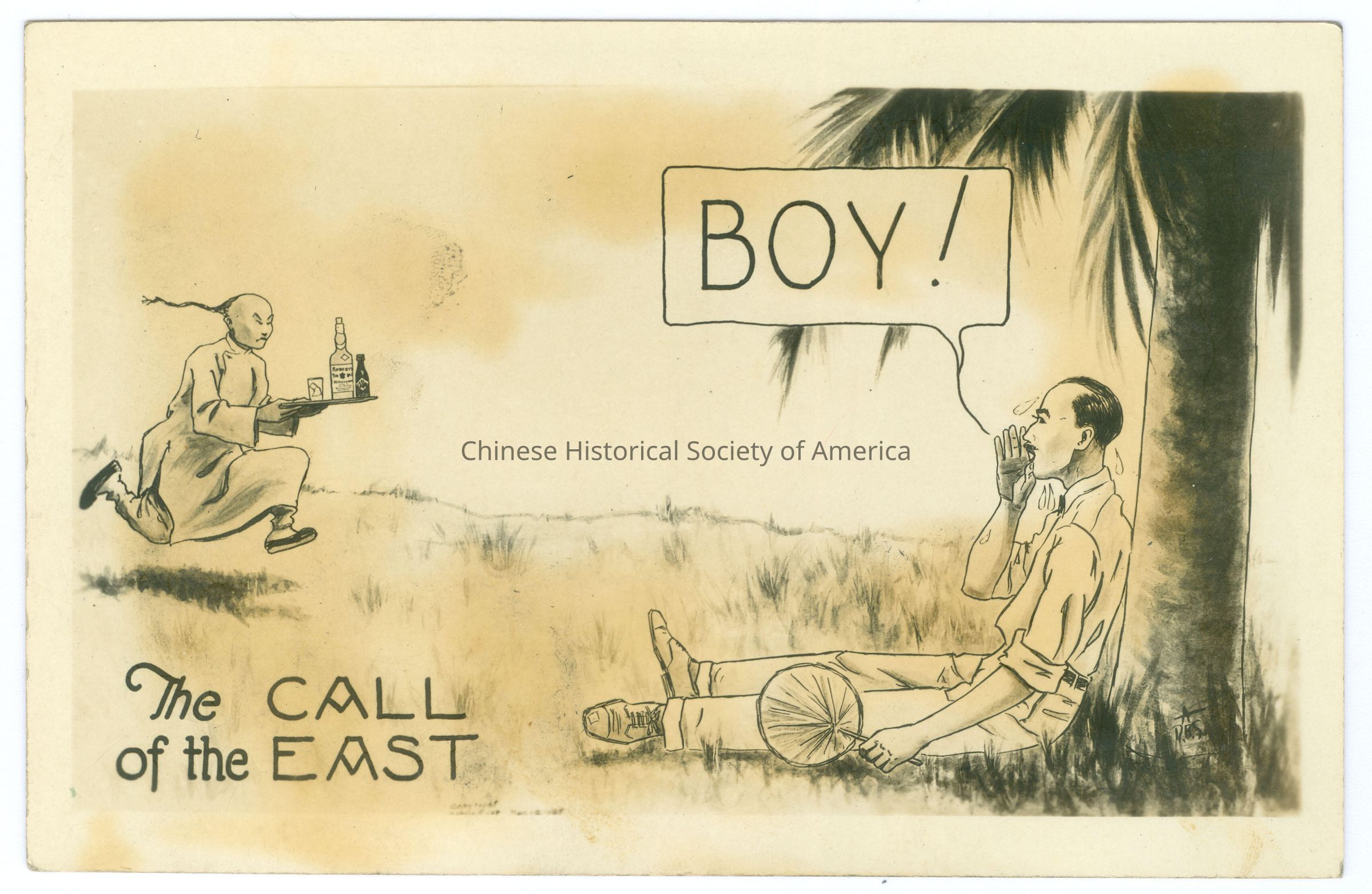 B&W. Illus. Caricatures; Chinese Men; Servants: A White man with a mustache is sitting under a plam tree with a fan, he is yelling "Boy!", a Chinese man in traditional clothing is running with his queues flying behind him and carrying a tray of drinks.