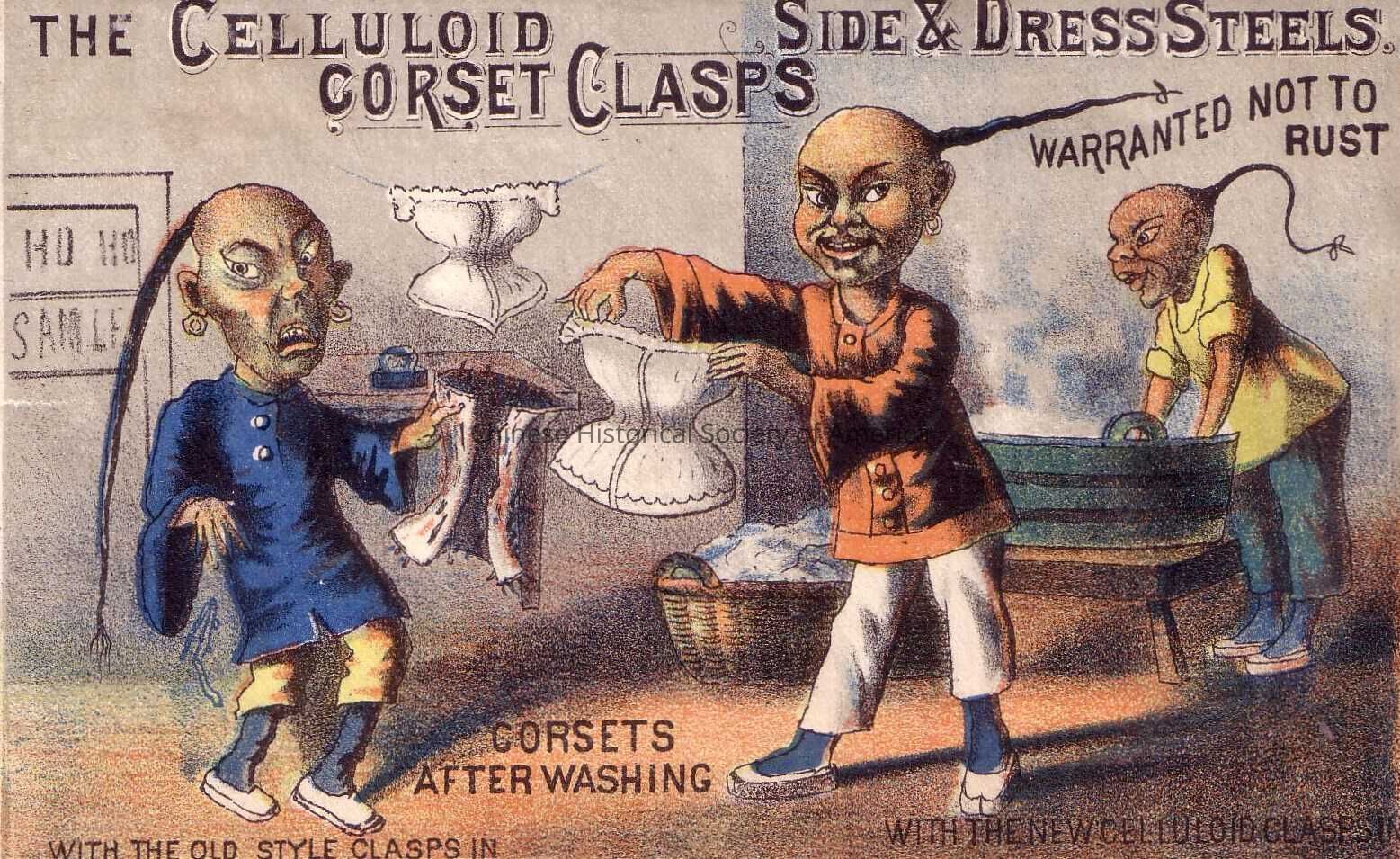 Front: In this scene three Chinese men are working in a laundry room. On the right side of the tradecard there is a man wearing a yellow shirt and blue pants and a queue, with both hands in a bucket of soapy water. Near the middle are two other men each holding a corset. The man on the left is holding a corset that still has dirty stains on it, some of the stains are also from the rusty clasps that is attached to the corset. While man holds a dirty clean corset, the other man in the middle is holding a white corset that is clean. Written on the tradecard is the following: The Celluloid Corset Clasps Side & Dress Steels-Warranted Not to Rust. Corset After Washing: With the Old, Style Clasps in...With the New Celluloid Clasps In.