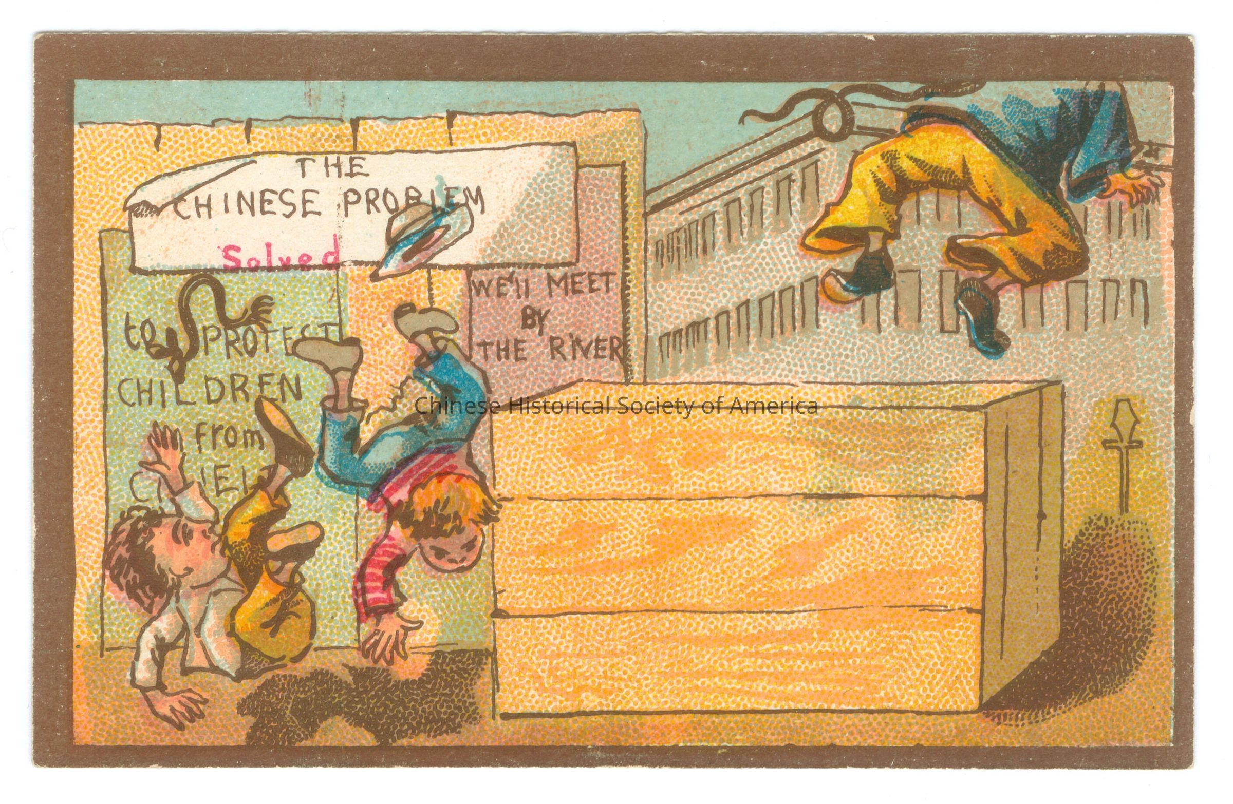 Front: Two boys, one in jeans and a red and white stripe shirt and the other in a white top and yellow pants, are falling back as the results of winning a tug-of-war with a Chinese Man's Queue. The Chinese man dressed in a blue shirt and yellow pants is flying off the wooden box after losing a section of his queue. Three signs are posted on the fence next to this scene...one partially hidden says "To Protect Children From..." the other says "We'll Meet By the River" and the third..."The Chinese Problem Solved."