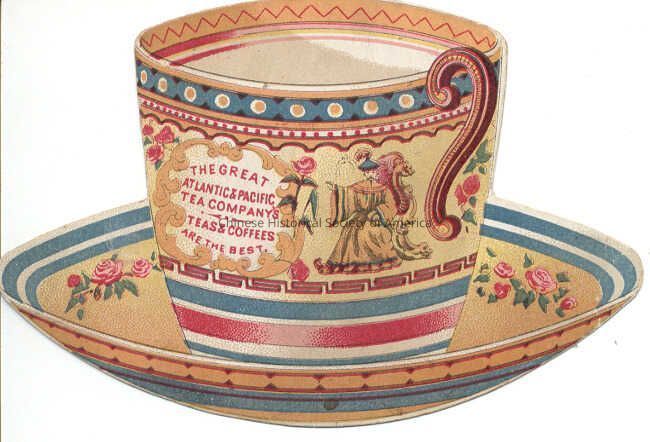 Front: In a teacup and saucer shape tradecard is a colorful decorated cut out. Where designed on the front of the cup is an old man sitting on a chair and written next to it is the following: "The Great Atlantic & Pacific Tea Company's Teas & Coffees Are the Best."