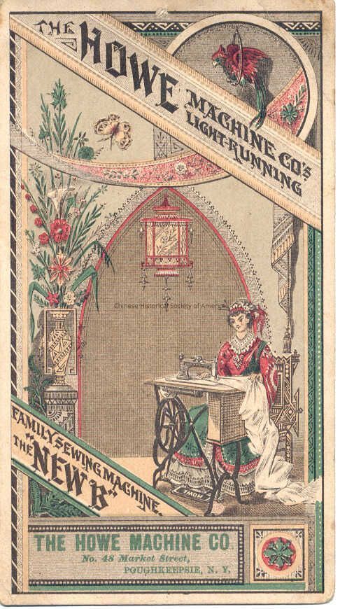 FRONT: A woman wearing a red and green Victorian style dress is sitting in the corner at her sewing machine, sewing a white piece of cloth under an arched decorated with flowers and a ceiling lamp. Written on the top corner of the illustration is "The Howe Machine Co's. Light-Running -Family Sewing Machine. The 'New B'." and at the bottom "The Howe Machine Co. No. 48 Market Street, Poughkeepsie, N.Y."