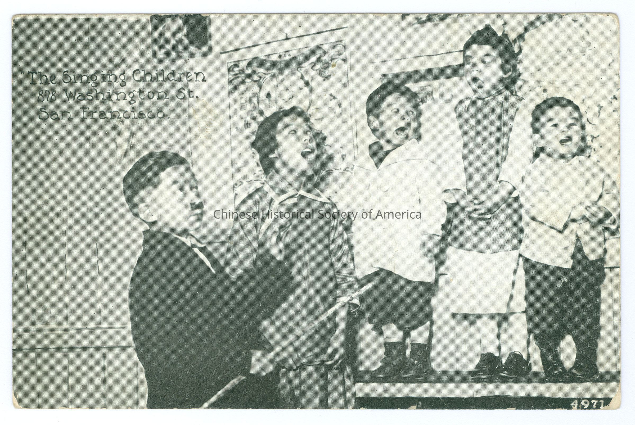 See CHSA-04270-04281. Front: Caption: "The Singing Children 878 Washington St. San Francisco. 4971." Back: "Pacific Novelty Co. San Francisco & Los Angeles." Old Accession #: DEX