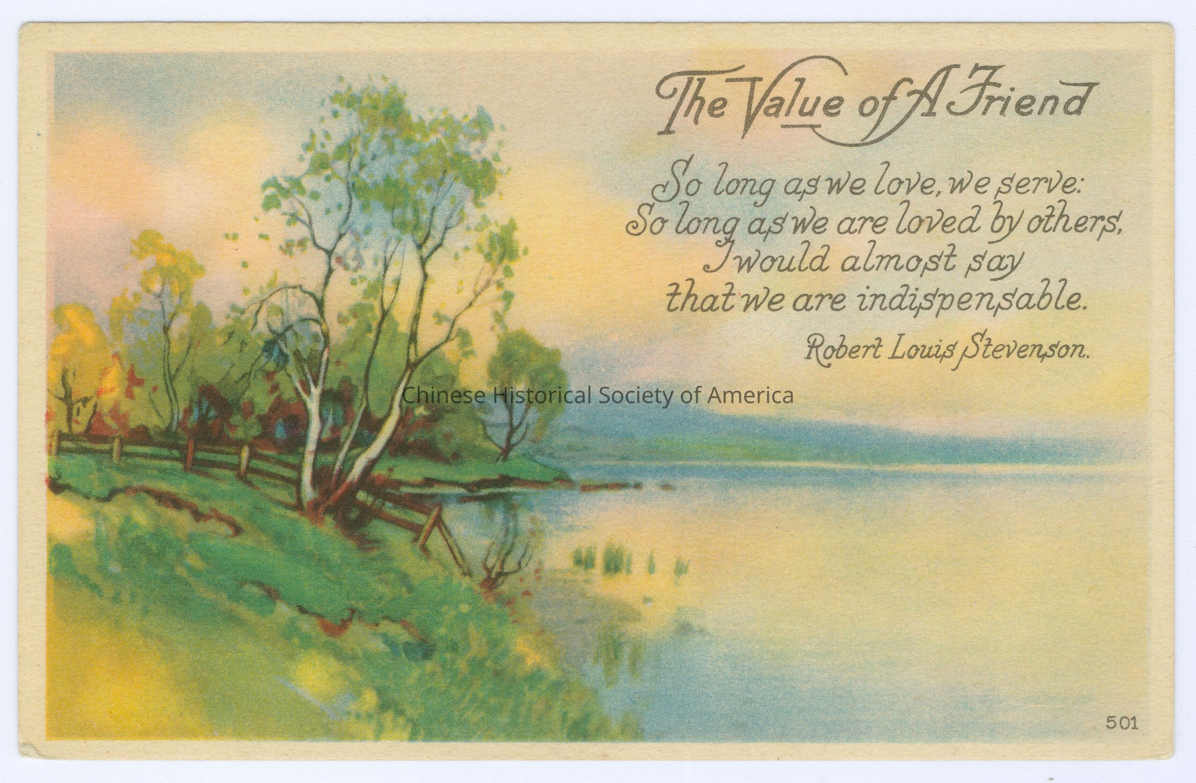 Front: Caption: "The Value of A Friend, So long as we love, we serve: So long as we are loved by others, I would almost say that we are indispensable. Robert Louis Stevenson." "501." Back: "Karle Rochester Quality." Old Accession #: )DX