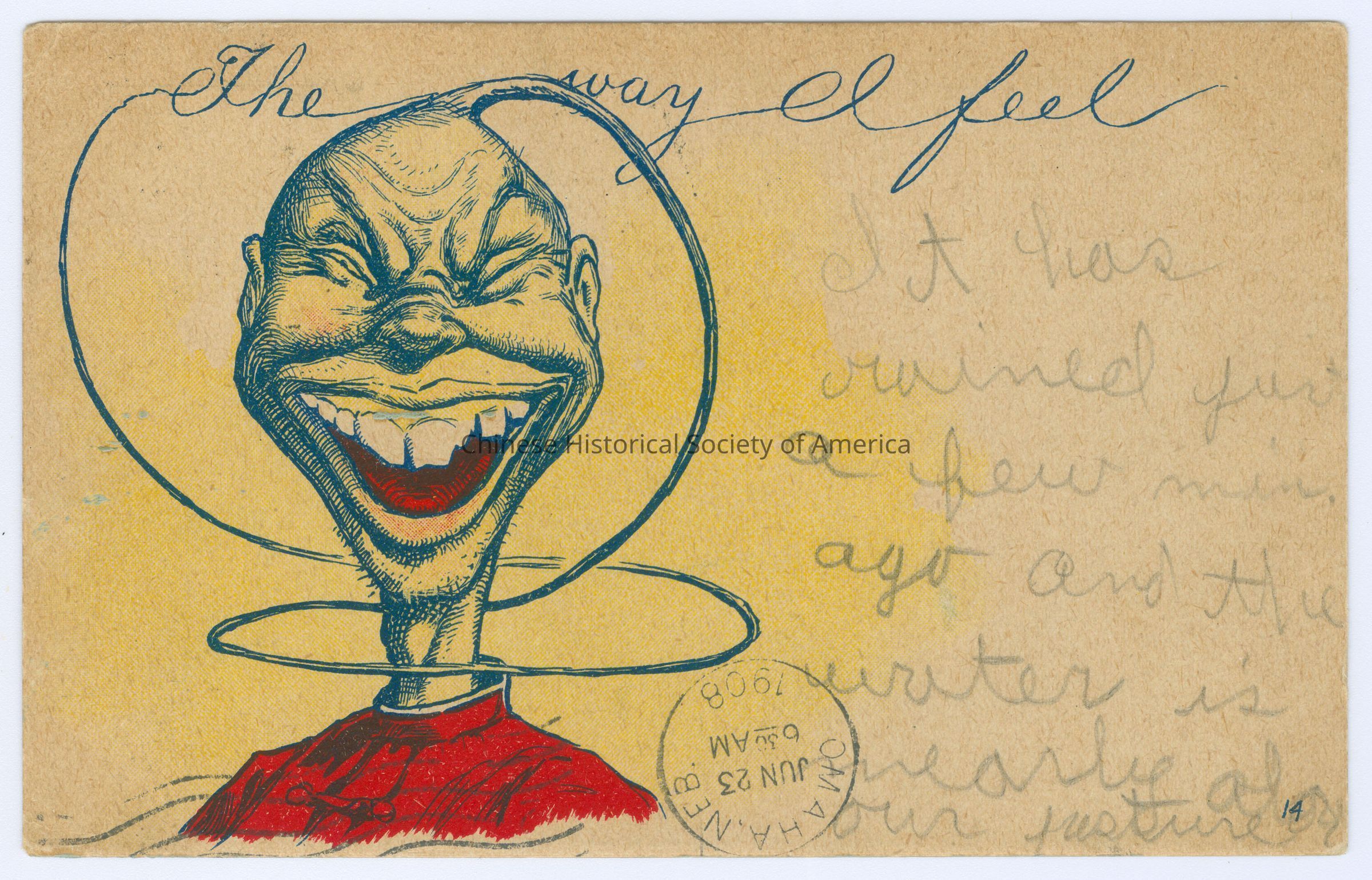 Color. Illus. Greeting Cards; Caricatures; Chinese Men: Head and shoulder shot of a Chinese man with a queue wrapped around his neck, his mouth is wide and eyes are shut in laughter, he is wearing a red shirt.