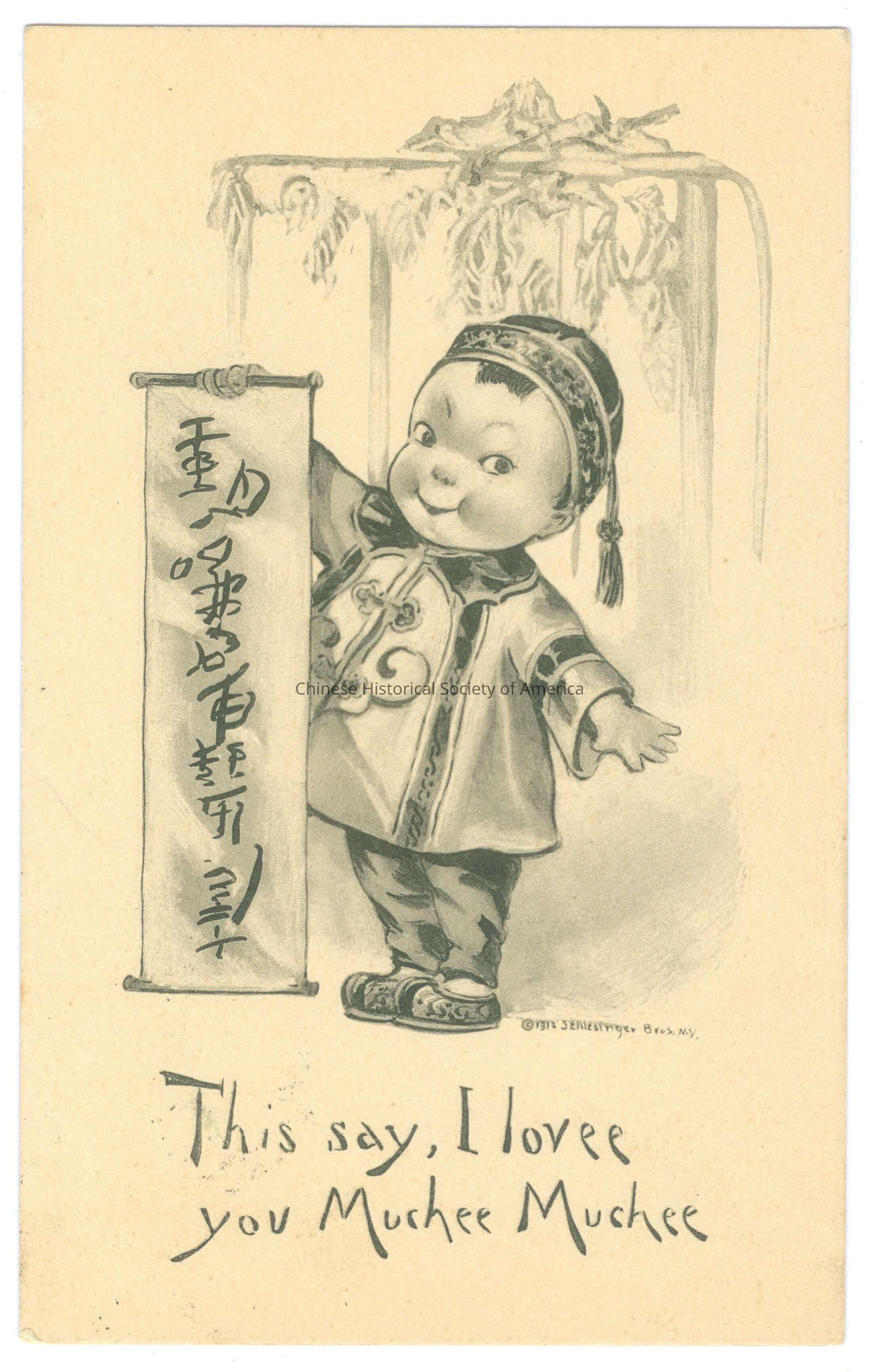 See CHSA-05004, 05005 B, 05006-05008. A: Front: Caption: "This say, I lovee you muchee muchee." "1912 Schlesinger Bros., N.Y." Back: Stamp: A green one cent stamp with a side picture of George Washington, "U.S. Postage, 1 Cent 1." Address: "Mr. C. [ILLEGIBLE] E. Anderson Parlia N.J." Message: "[ILLEGIBLE] on Christmas from [ILLEGIBLE] L. W. N. Anderson". Old Accession #: GEX
