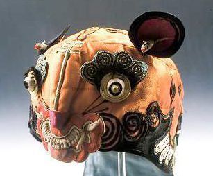 Black silk, with orange silk tiger overlay, embroidered with black stitched stripes. Inside each ear is a stuffed gray rat figure. Silver paper "Wang" King character on bridge of nose.Context