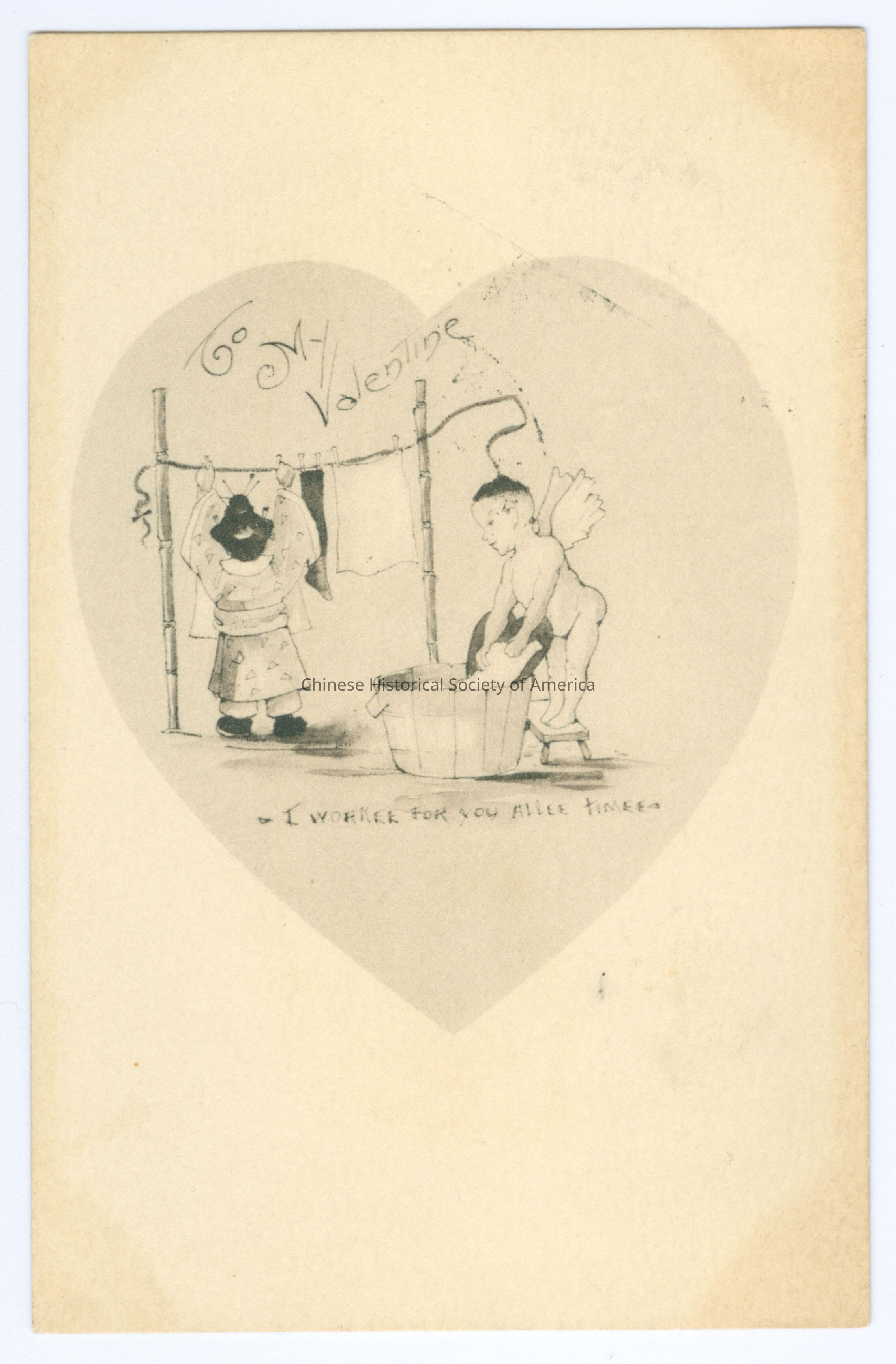 B&W. Illus. Caricatures; Valentine Cards; Laundry: In a heart shaped area, there is a naked cupid with wings washing clothing on a heart shaped wash board, has a que that is stretching to make a clothesline that a woman in a kimono is hanging clothes on.