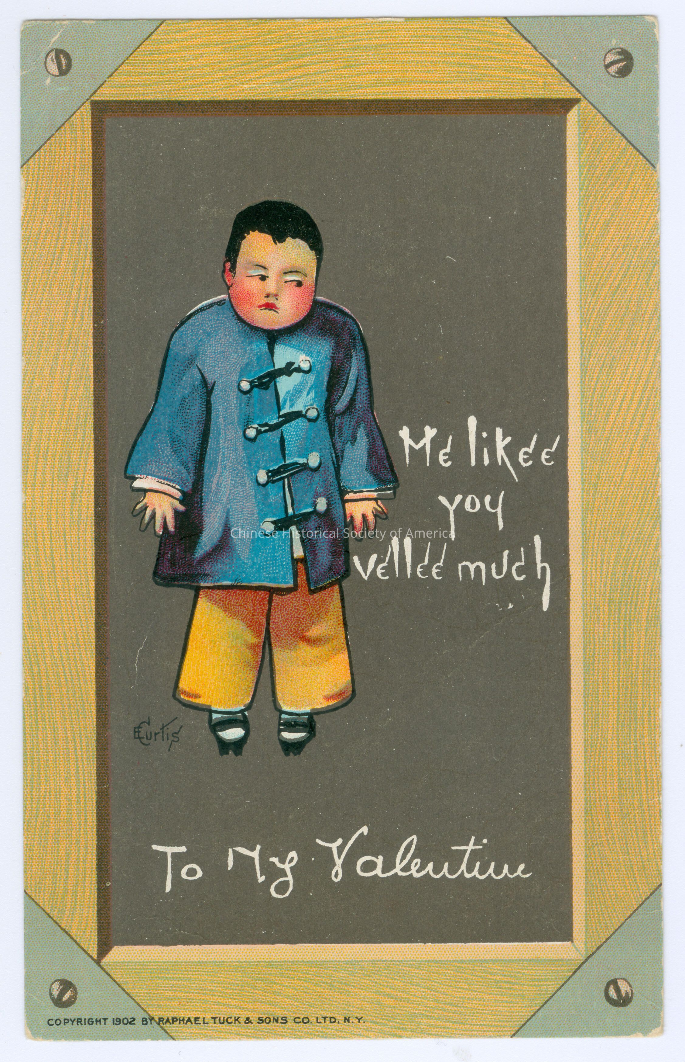 Front: Caption: "Me likee you vellee much To My Valentine." "E. Curtis." "Copyright 1902 by Raphael Tuck & Sons Co., Ltd. N.Y." Back: Message: "Min Ruth Curtis Mayell, Concord Junction Mass", handwritten in black. Old Accession #: GNTM
