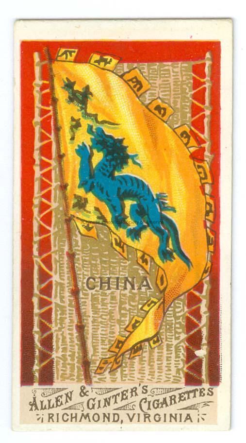 Color. Illus. US; Virginia; Allen & Ginter's Cigarettes: A red background with a bamboo screen, over the screen is a yellow flag with a blue dragon on it and "China" on the screen. Front: "Allen & Ginter's Cigarettes, Richmond, Virginia." Back: The middle of the back of the trade card is covered in a piece of paper. "Flags of All Nations", with a listing of the countries under it. Old Accession #: DAE