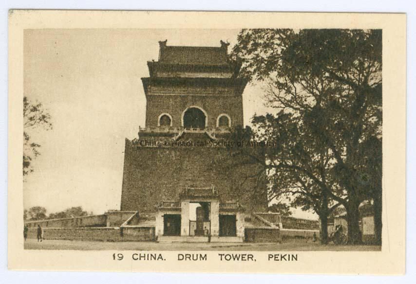 B&W. Photo. England; London; M.E. Notaras Ltd.: Front: Caption: "19 China. Drum Tower, Pekin." See CHSA-07887-07910. Back: "Silver Car Cigarettes A Good Quality Virginia Cigarette Made By M.E. Notaras Ltd. London", there is an illus. of cigarettes in a canister. Old Accession #: N/A