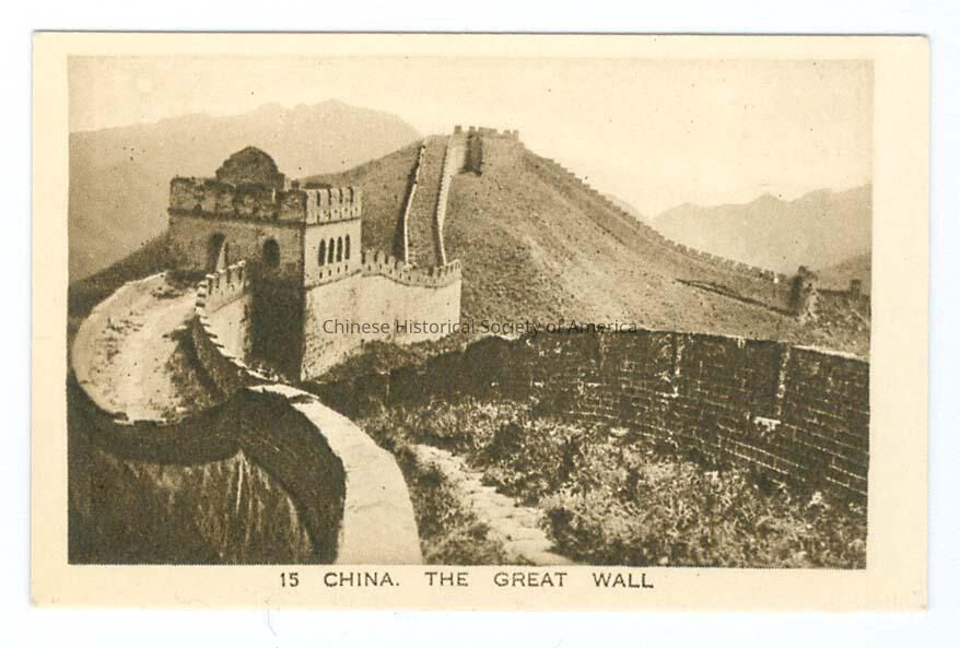 B&W. Photo. England; London; M.E. Notaras Ltd.: Front: Caption: "15 China. The Great Wall." Back: "Silver Car Cigarettes A Good Quality Virginia Cigarette Made By M.E. Notaras Ltd. London", there is an illus. of cigarettes in a canister. Old Accession #: N/A