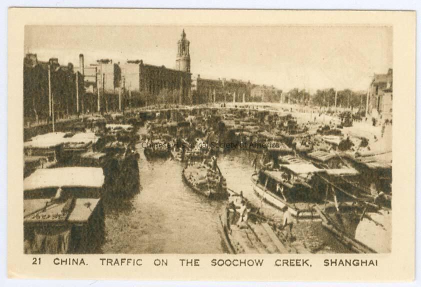 B&W. Photo. England; London; M.E. Notaras Ltd.: Front: Caption: "21 China. Traffic On The Soochow Creek. Shanghai." Back: "Silver Car Cigarettes A Good Quality Virginia Cigarette Made By M.E. Notaras Ltd. London", there is an illus. of cigarettes in a canister. Old Accession #: N/A
