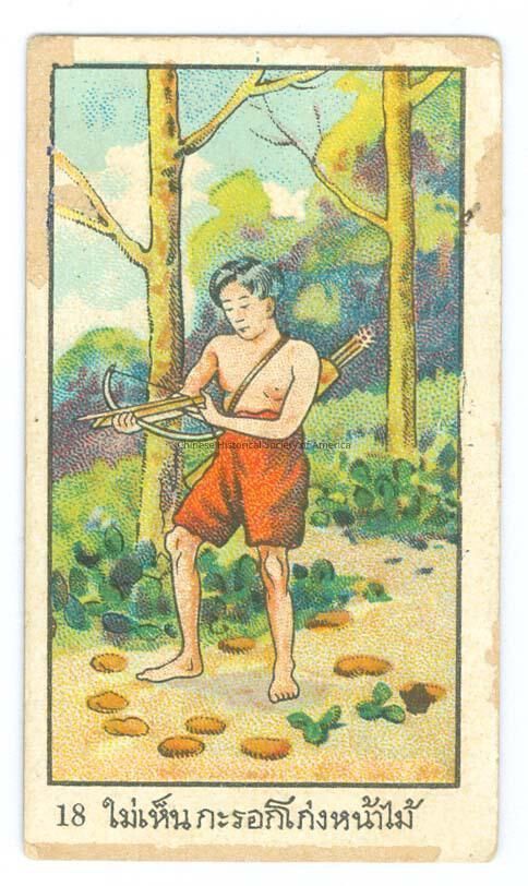 CHSA-07924 A-C. Color. Illus. Misc.: A-C: Illus. of a young barechested man wearing only red short pants, he has a quiver of arrows slung over his shoulder and is loading his bow. A-C: Front: "18", with caption in a Middle Eastern language. A-C: Back: Illus. of a cigarette box with Middle Eastern writing on it and a illus of a flag, on the side of the box "10 Cigarettes." Old Accession #: N/A