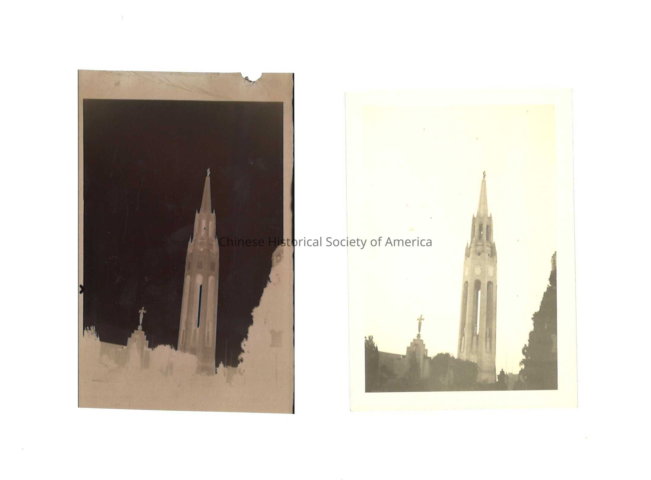 A: A tall hexagonal tower in the clear sky with a statue of the Pacfic Ocean goddess Pacifica. A shorter tower on the left with a female statue on top. B: photo negative