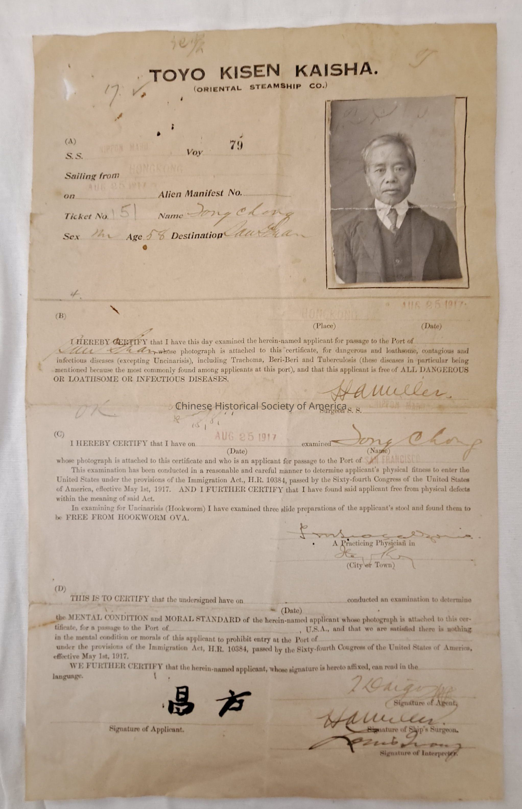 Ship manifest for Fong Chong August 25, 1917