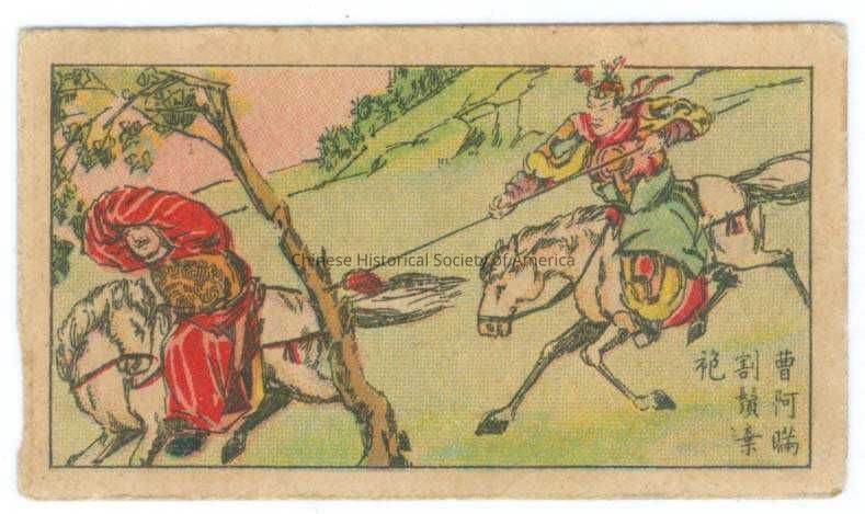 Trade card, Chinese man on white horse charging after another manEntry/Object ID
