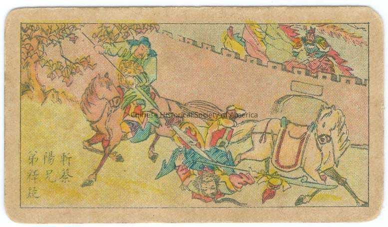 Color. Illus. China; Canton; Guang Dong Nan Yang Bros. Co.: A Chinese man is on the wall watching another Chinese man on a horse spear the fallen man on the ground.