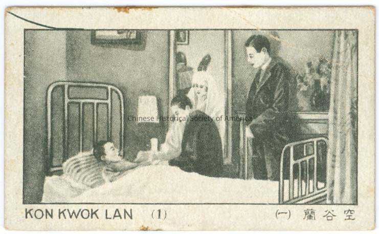 B&W. Illus. China; Shanghai; Chien Wha Tobacco Co.: A Chinese woman is in a hospital bed with a man sitting by her bedside and another man standing behind him with a nurse sitting nearby.
