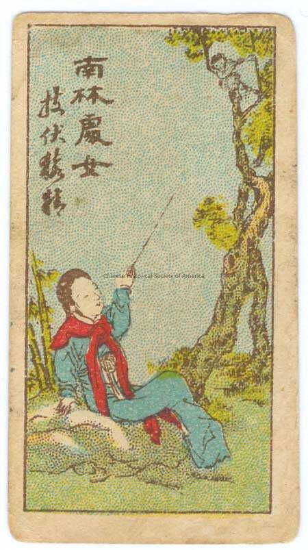 CHSA-07835 A-E. Color. Illus. China; Canton; Guang Dong Nan Yang Bros. Co.: A-E: A Chinese woman wearing traditional Chinese clothing in blue with a red scarf, she is leaning against a rock outside and pointing up with a long thin branch.