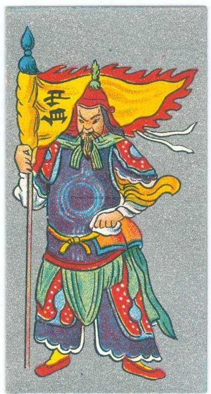 Color. Illus. England; London; Cavanders Ltd.: Silver background with an illus. of a Chinese general in full uniform, his uniform is red , green and blue, he is holding a yellow flag with red trim.