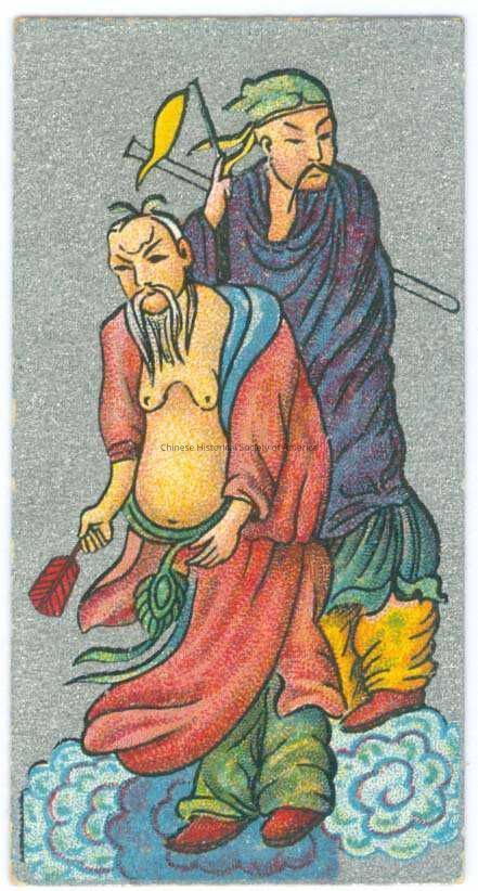 Color. Illus. England; London; Cavanders Ltd.: Silver background with 2 illus. of 2 immortal Gods, one is Han Chung-le the fat man and the other is Leu Tung-pin carrying a sword.