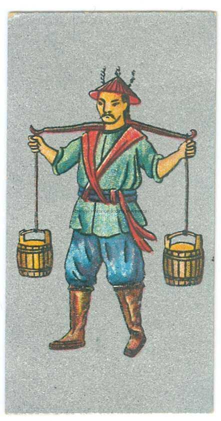 Color. Illus. England; London; Cavanders Ltd.: Silver background with a illus. of a Chinese man wearing a red straw hat with a mustache, he has a pole balanced across his shoulders from which rope hang on the end holding two buckets.