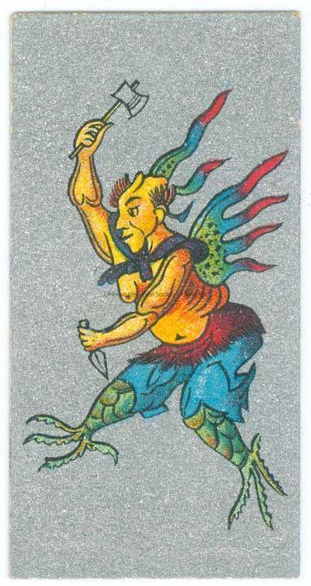 Color. Illus. England; London; Cavanders Ltd.: A silver background with an illus. of a "man with scaled claw like feet with green, blue and red wings and is holding a chisel and ax.