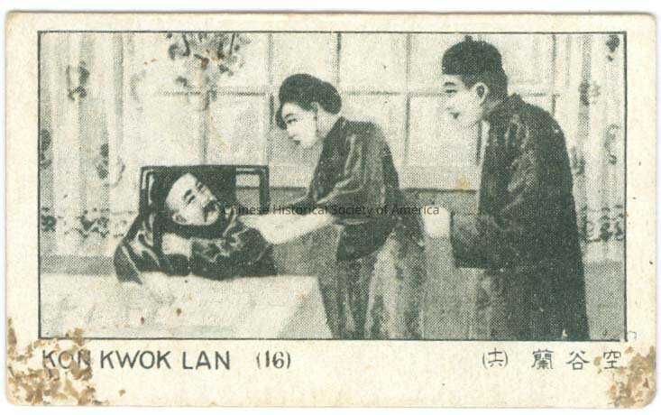 B&W. Illus. China; Shanghai; Chien Wha Tobacco Co.: A older Chinese man with a mustache is sitting in a chair while a Chinese woman stands over him, a younger Chinese man wearing a hat is standing nearby.