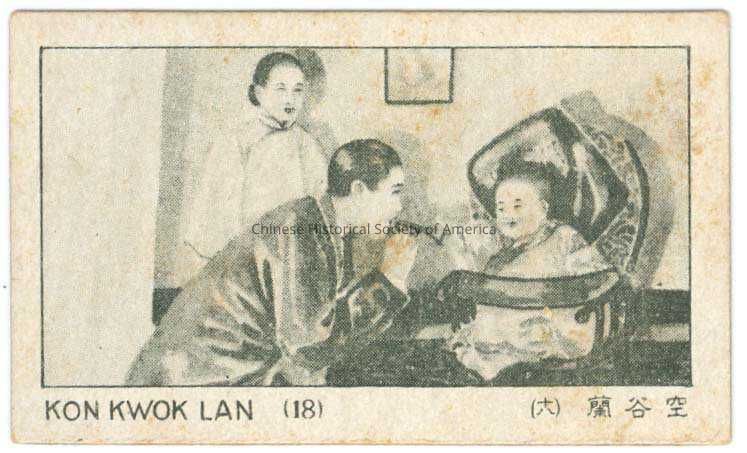 Trade card, Older Chinese woman watching younger man coo at babyEntry/Object ID