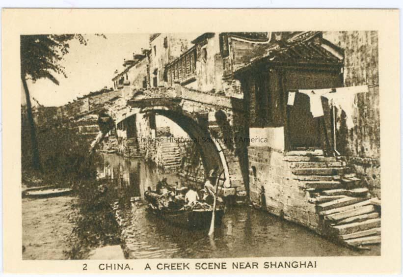 B&W. Photo. England; London; M.E. Notaras Ltd.: Front: Caption: "2 China. A Creek Scene Near Shanghai." See CHSA-07887-07910. Back: "Silver Car Cigarettes A Good Quality Virginia Cigarette Made By M.E. Notaras Ltd. London", there is an illus. of cigarettes in a canister. Old Accession #: N/ADimensions