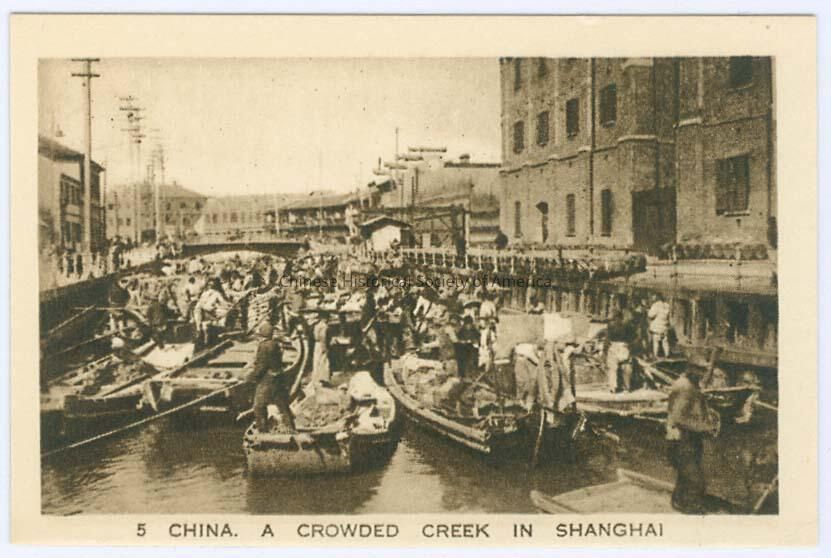 B&W. Photo. England; London; M.E. Notaras Ltd.: Front: Caption: "5 China. A Crowded Creek In Shanghai." See CHSA-07887-07910. Back: "Silver Car Cigarettes A Good Quality Virginia Cigarette Made By M.E. Notaras Ltd. London", there is an illus. of cigarettes in a canister. Old Accession #: N/ADimensions