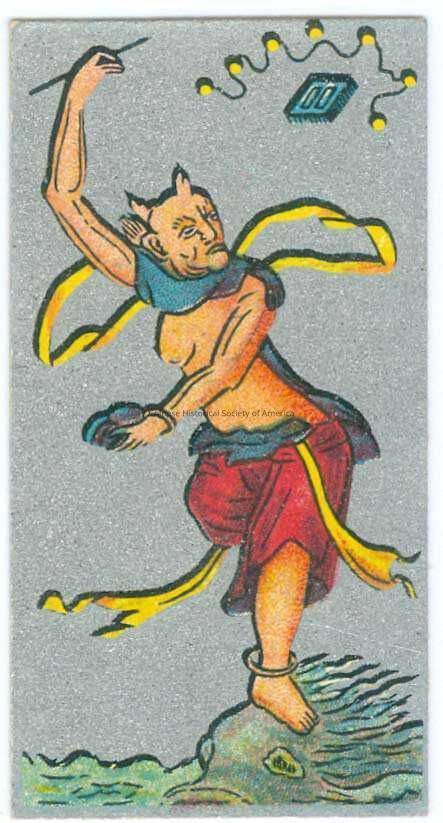 Back: "Ancient Chinese No. 13."; "Kue Sing is one of the two stars which the Chinese profess to have discovered to have the supervision of the affairs of this world relating to literature and the pencil. This star is represented as an ugly-looking man with a head having two horn-like projections, standing by one foot on the head of a large fish. He is worshiped in colleges and high schools on the 1st and 15th of each month.