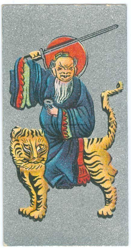 Color. Illus. England; London; Cavanders Ltd.: Silver background with an illus. of an old Chinese man with a white beard is sitting on top of a tiger wielding a sword above his head. See CHSA-07862-07886. Back: "Ancient Chinese No. 16"; "This picture of a grim-looking man sitting on a tiger, with one arm raised and holding a sword, is painted on the black sedan used on the occasion of a bride returning to her parents' house on a visit, on the third day after marriage. The individual represents a great magician, head of a class of Tauist priests. He is supposed to ward off the pernicious influences of evil spirits who otherwise might cause injury or sickness to the bride.