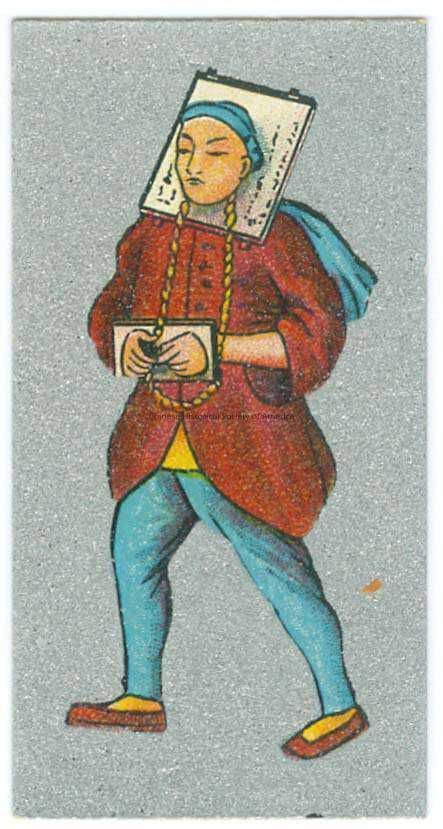 Color. Illus. England; London; Cavanders Ltd.: Silver background with an illus. of a Chinese man with his head in a cangue with his hands in wooden cuffs.