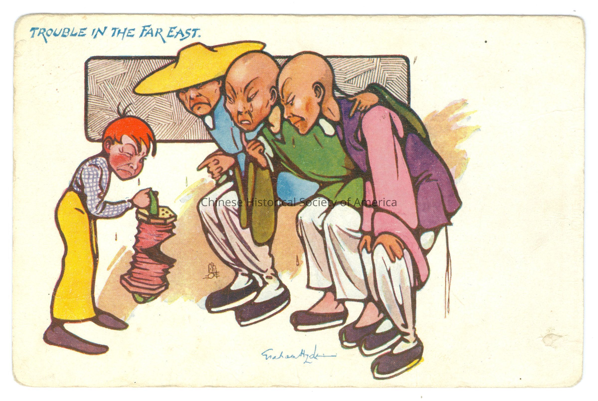 CHSA-04936 A-B. Color. Illus. Eraham Hyde Caricatures; Chinese Men: A-B: 3 Chinese men with slanted eyes and queues are bent over looking at the torn accordion the little red haired White boy is crying over.
