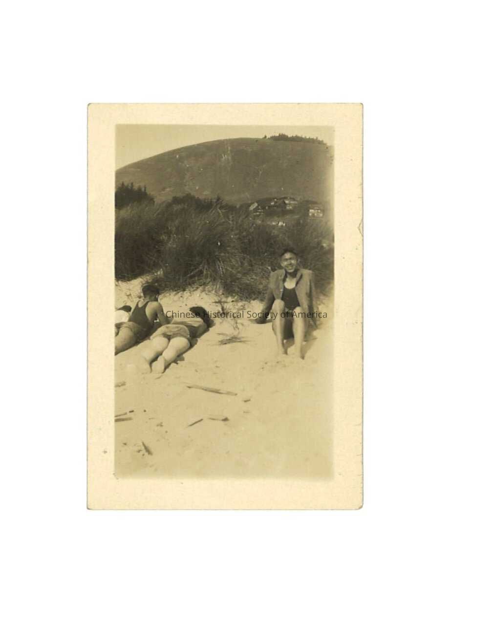 Black and white photo of Chinese men/women laying and sitting on the beach.