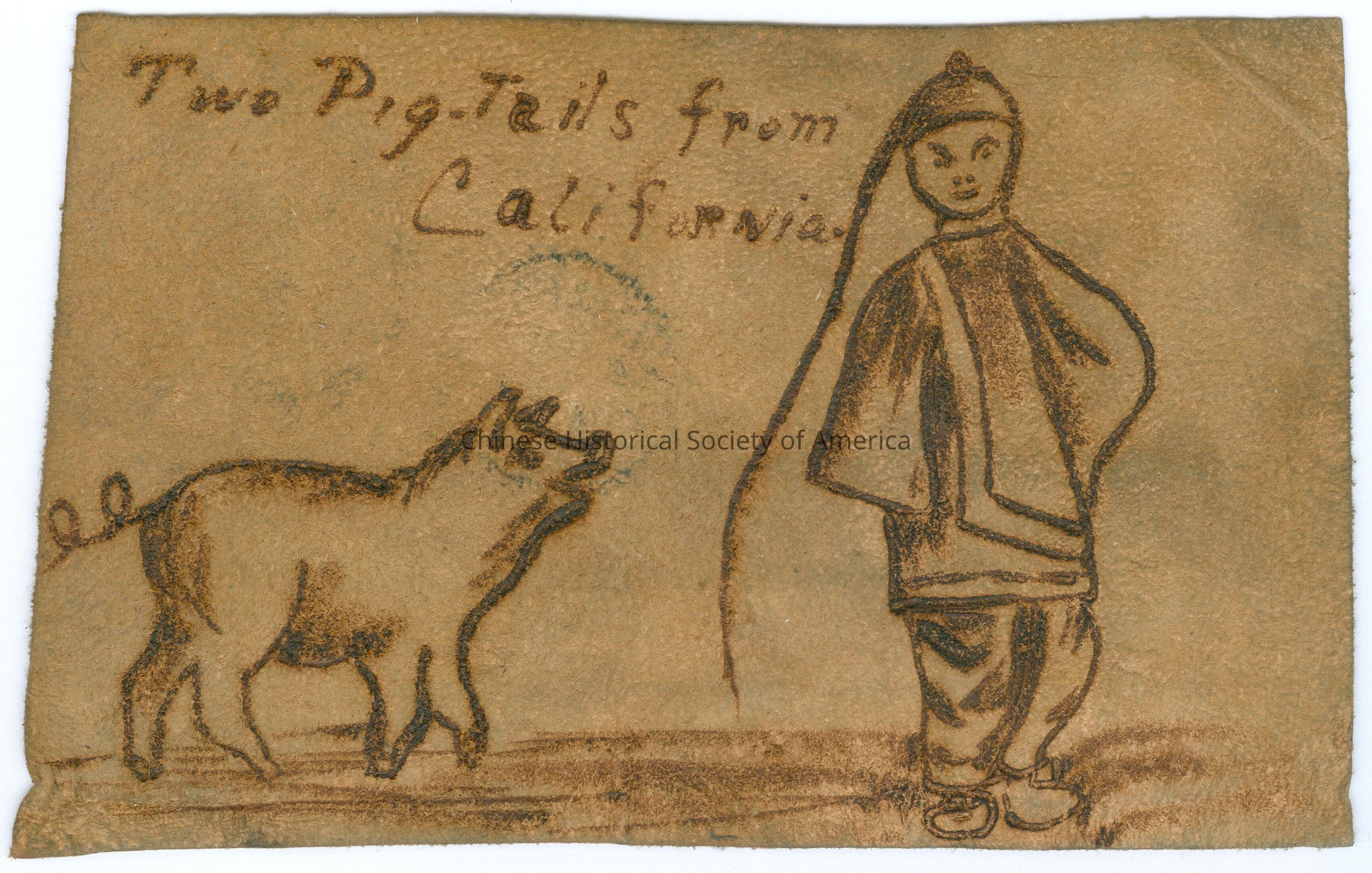 See CHSA-04975-04983. Front: Caption: "Two Pigtails from California." Back: Postmark: "Los Angeles, Cal. Oct 5 1904 7 PM", stamped in black. Stamp: A green one cent stamp with a picture of Benjamin Franklin, "Series 1902, United States of America, One Cent". Addressee: "Master Edward Fitzpatrick 928 Oak St. San Francisco, Cal."
