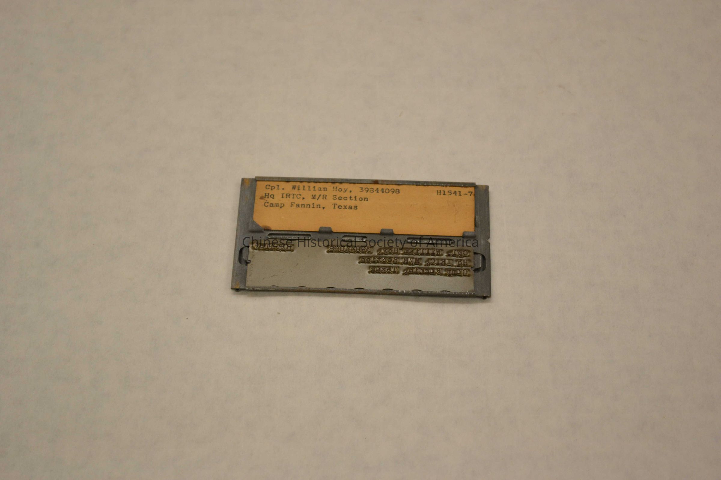Matel piece; Cpl. William Hoy, 39844098 Hq IRTC, M/R Section Camp Fannin, Texas H1547-7