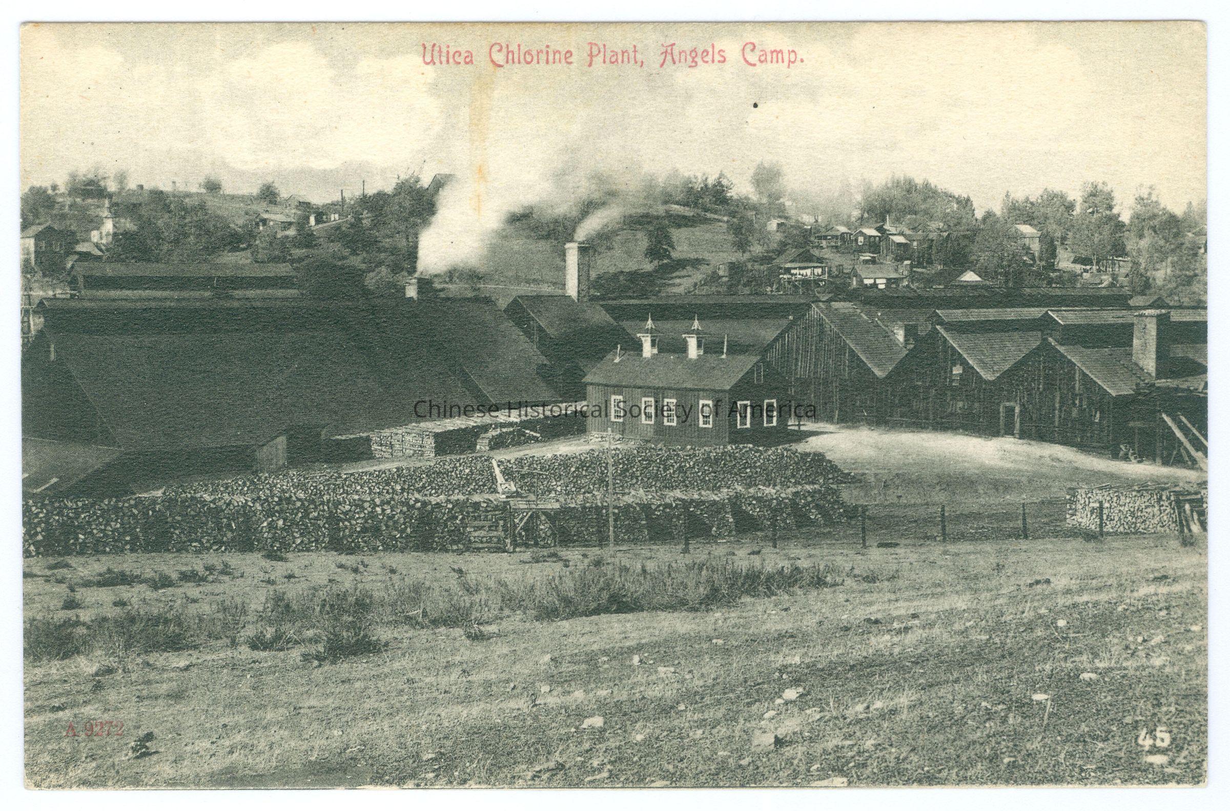 Front: Caption: "Utica Chlorine Plant, Angels Camp." "45." Back: "Publ. by the City Drug Store, Angels Camp, Cal. Germany"; "SL & Co." Old Accession #: N)-
