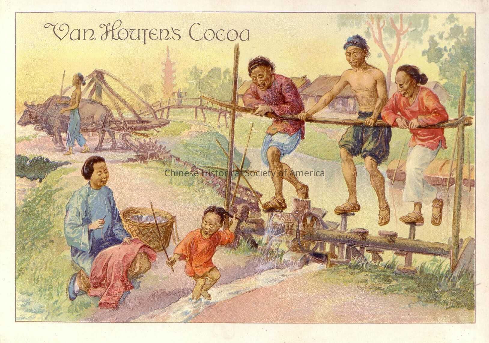 Front: In a village scene next to a river is a family leisurely enjoying some time off. Near the river and a water wheel is a woman on her knees washing and stitching up clothes while her daughter plays in the small stream. Three men are standing near the river bed hanging over a wooden barrier watching the child play. Another man is walking next to an ox who is pulling something from the river. On the upper left hand corner is the notation for "Van Houten's Cocoa"