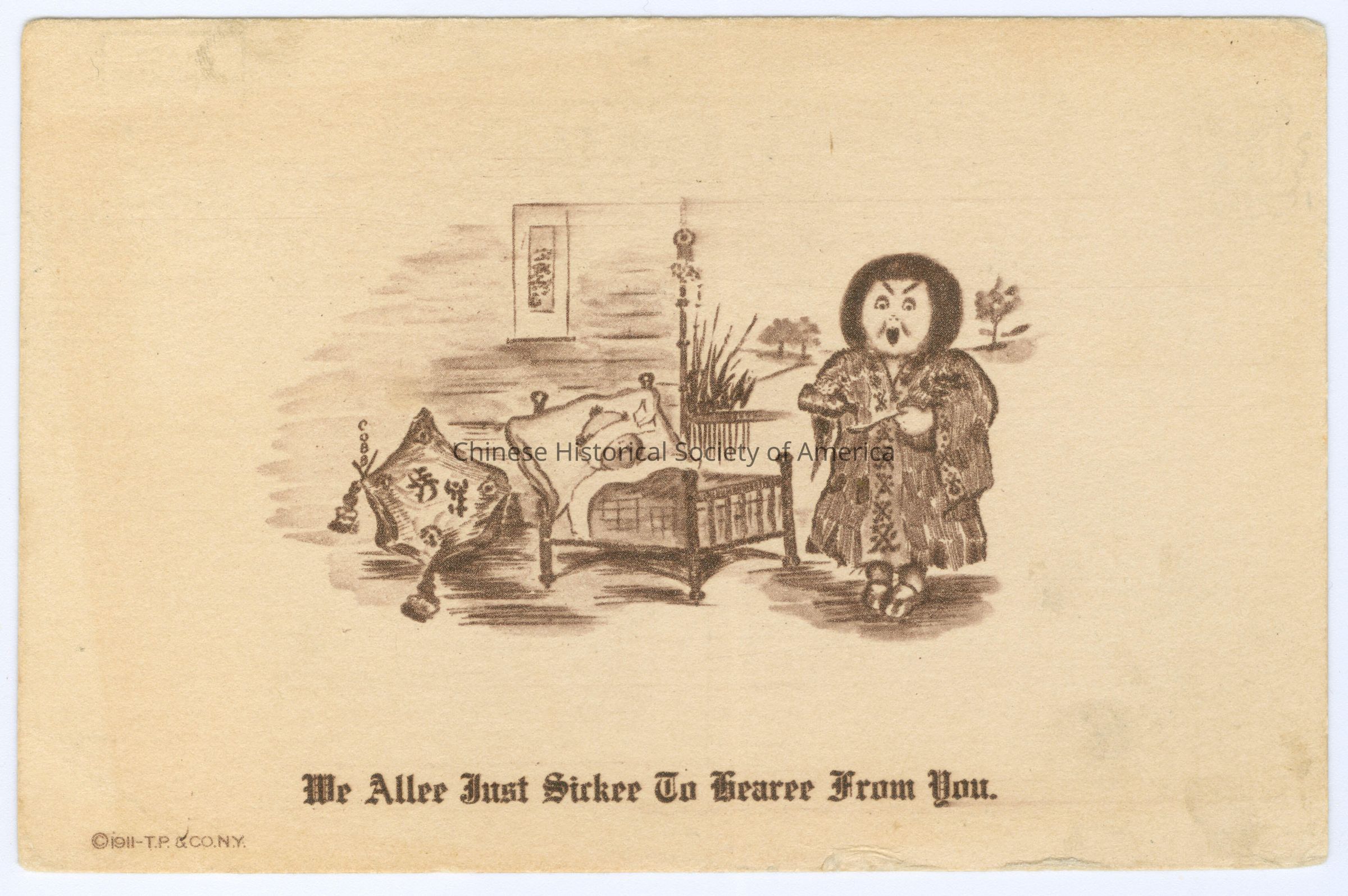 See CHSA-05021-05024. Front: Caption: "Me Allee Just Sickee To Hearee From You." "1911-T.P. & Co. N.Y." Back: Postmark: "Indianapolis ND, Oct 21 9 PM", stamped in black. Stamp: A green one cent stamp with a side picture of Benjamin Franklin, "U.S Postage One Cent". Address: Mrs. A.R. Goldman, Safford, Arizona. Message: "29 S. Hawthorne Lane, Indianapolis, Ind."