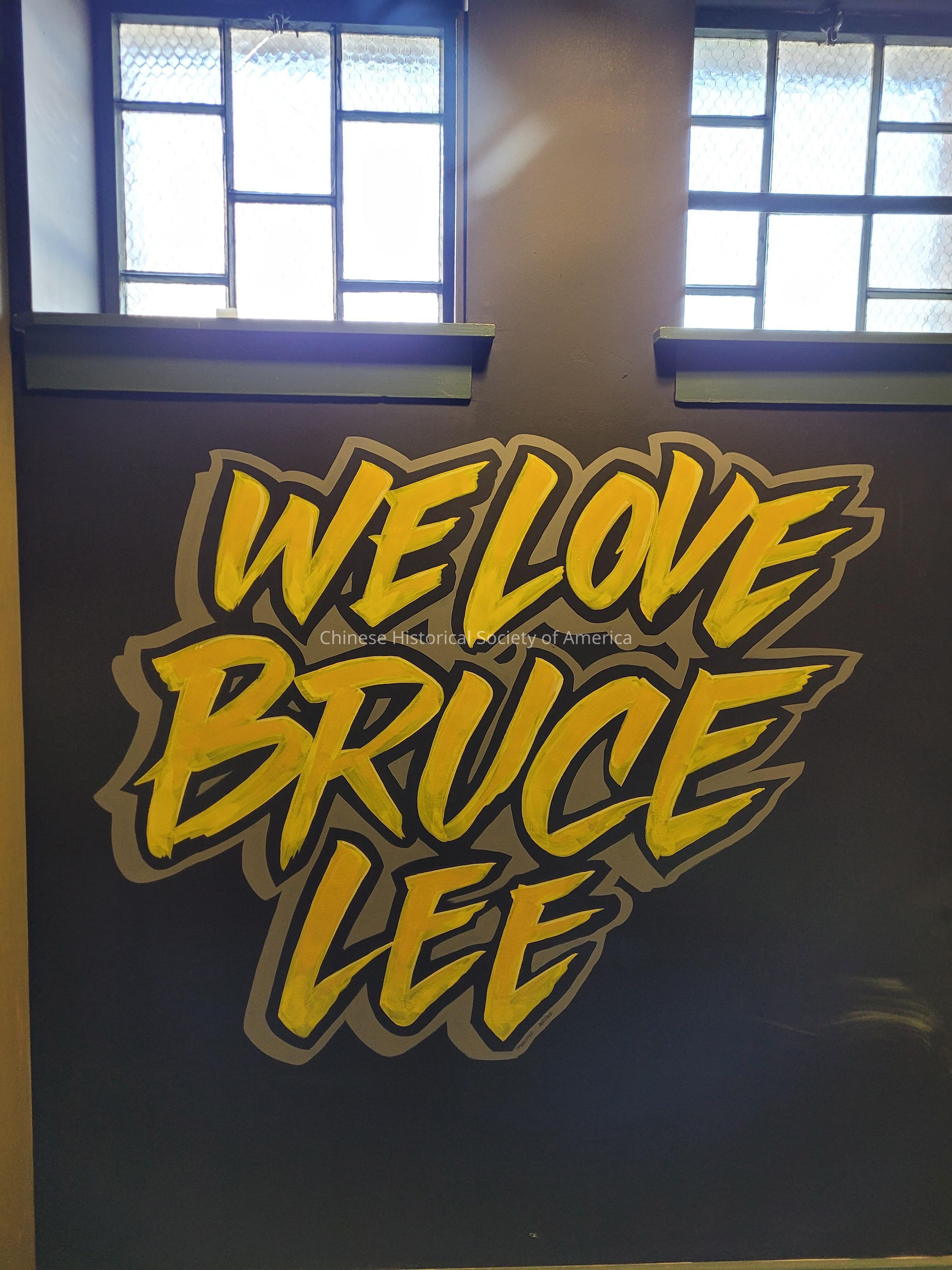 Mural with text “We Are Bruce Lee” hand-painted in black, yellow, and gray.Made/Created